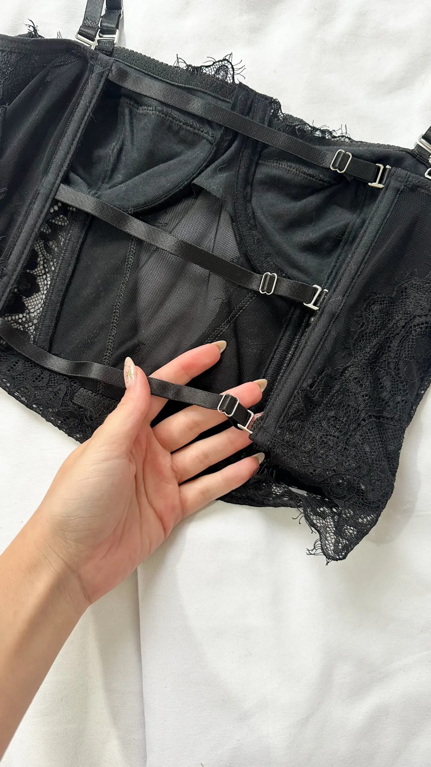 CONJUNTO DANI EM RENDA CHANTILLY E TULE S/ BOJO C/ ARO ALCAS REMOVIVEIS E PALETAS DE SUSTENTACAO CALCINHA TODA EM RENDA